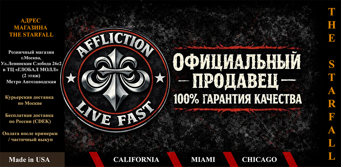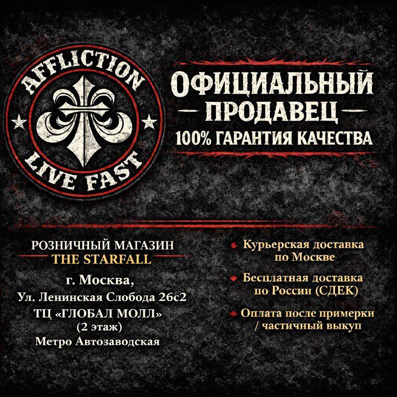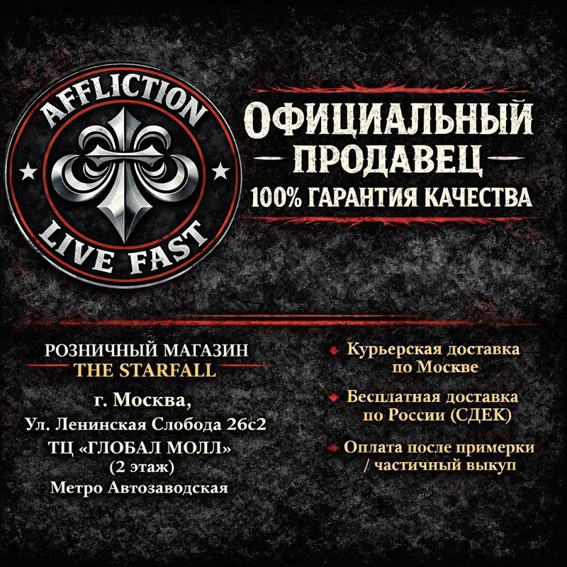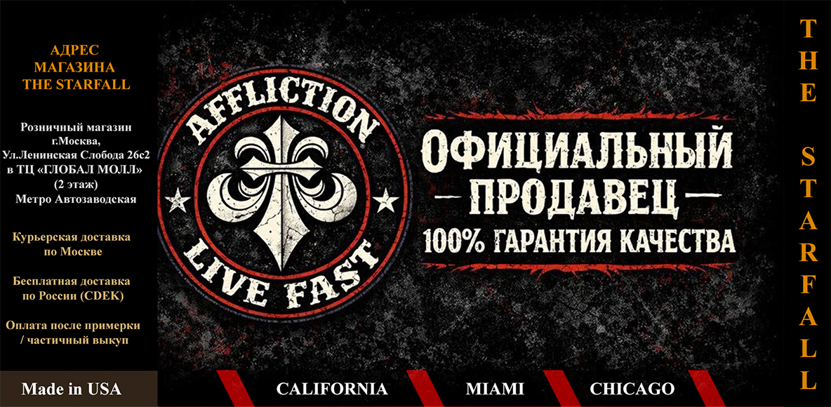 Вся одежда Affliction из США, представленная на сайте, доступна в интернет магазине, и мы можем отправить Вам в течение суток после получения заказа. Также осуществляем бесплатную доставку по всей России: Москве, Санк-Петербурге и в более 7000 населенных пунктов. Оплата понравившейся модели после примерки. >>> ГАРАНТИЯ ПОДЛИННОСТИ ПРОДУКЦИИ (ПОСМОТРЕТЬ) <<<