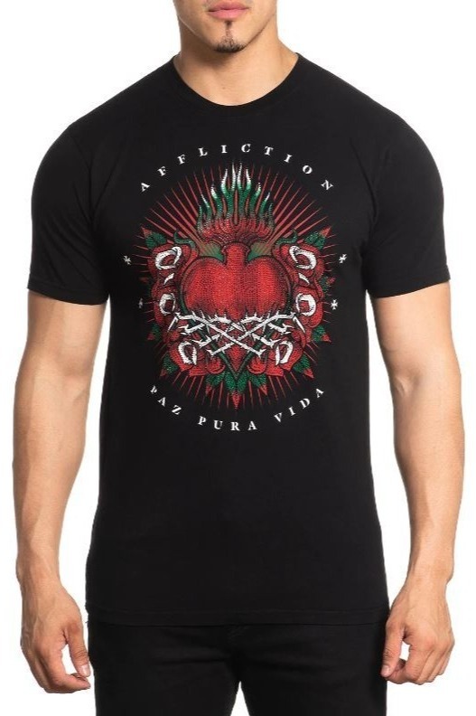 На груди — крупная композиция с пылающим “sacred heart”: объёмное красное сердце с зелёными языками пламени наверху, вокруг — алые лучи-сияние и розы с листьями, собранные в симметричный венок. Центральную часть сердца перехватывает переплетение, напоминающее проволоку/шнуровку, из-за чего принт выглядит более “жёстким” и динамичным. По дуге сверху идёт надпись AFFLICTION, снизу — PAZ PURA VIDA, а мелкие искры/звёздочки по бокам добавляют графике “сверкания”. Отдельные элементы усилены стразами, поэтому рисунок заметно играет на свету.