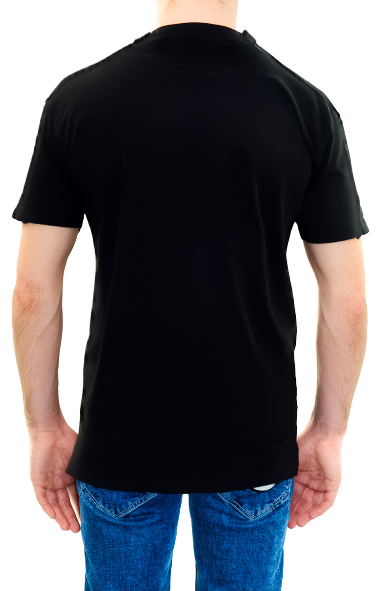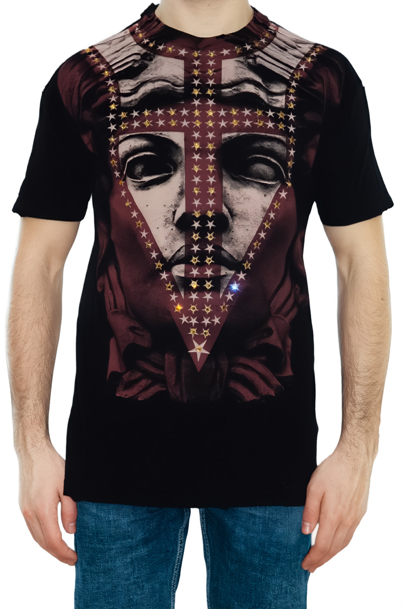 Удивительная мужская футболка PILLARS OF HEAVEN The Saints Sinphony (Столпы небесные) с изображением Горгонейона. Сделана из премиального хлопка. Декорирована вручную металлическими клепками. Медуза Горгона - мифическое создание с женским лицом и змеями вместо волоc. По поручению Афины Медуза была убита Персеем. Ее отрубленная голова была прикреплена к легендарному щиту-эгиде, впоследствии названному Горгонейоном. В период античности маску-талисман Горгонейон использовали как защиту от порчи и сглаза, а также украшали ею фасады зданий.