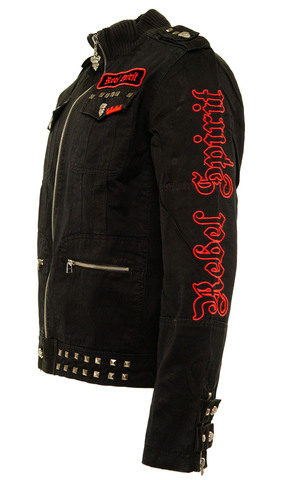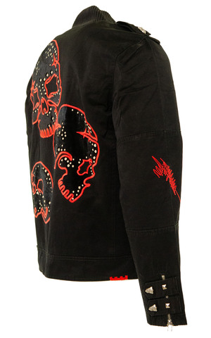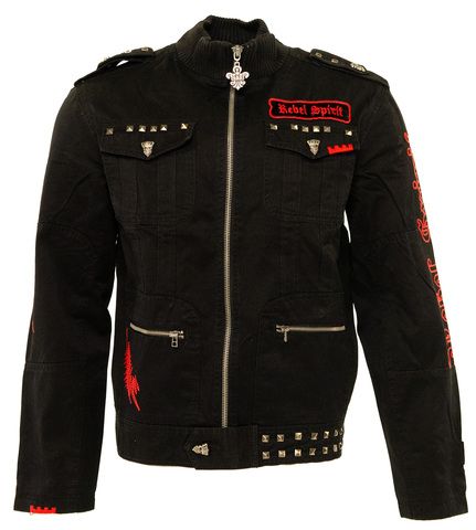 Черная мужская толстовка BJK200 Rebel Spirit с застежкой на молнию. Прямой крой. Воротник стойка на резинке. Два центральных накладных кармана на молнии и два нагрудных кармана клапана, застегивающихся на фирменную металлическую пуговицу в форме черепа. Дизайнерские погоны. Металлические молнии на манжетах. Спинка толстовки декорирована аппликациями в форме черепа, дополнительно оформленными металлическими заклепками. Особое внимание стоит уделить поясу толстовки, декорированному фирменной металлической фурнитурой.